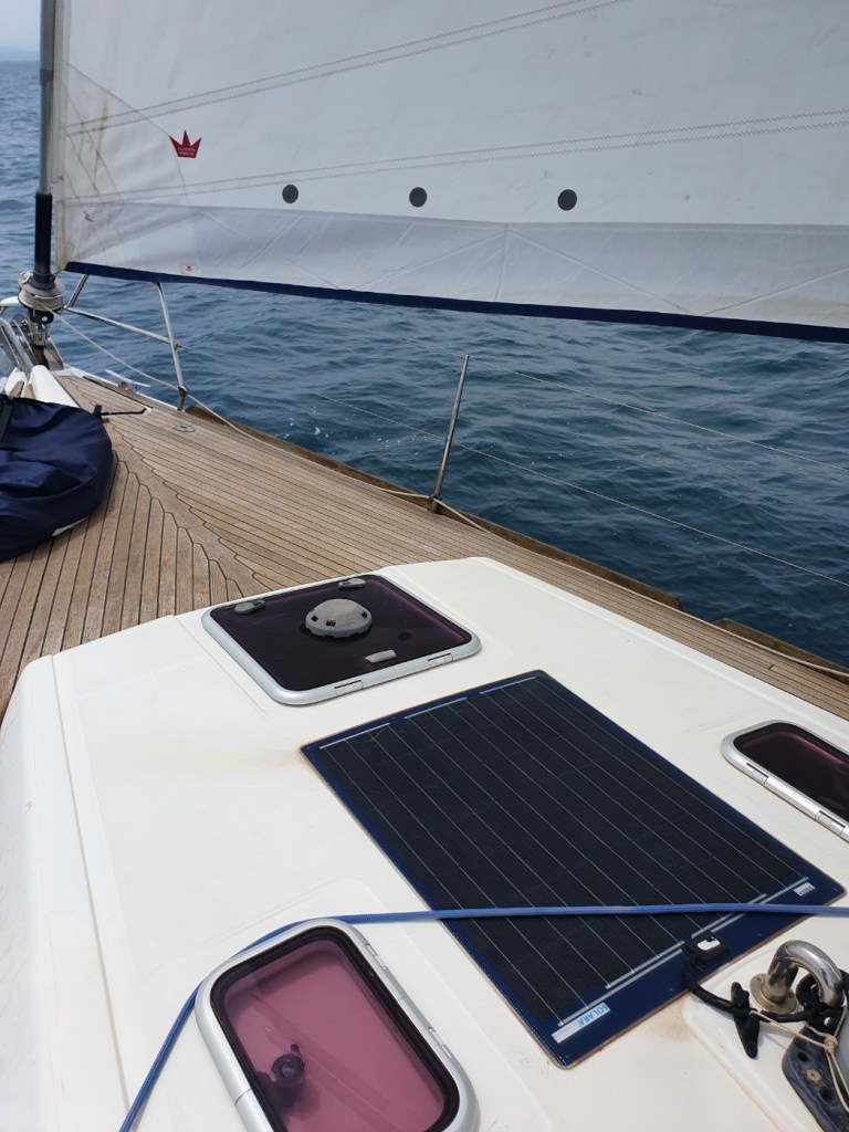 Seguridad y emergencias: Dispone de 5 pulseras personales con interface bluetooth que avisan en caso de caída al agua de algún tripulante. Un teléfono satelital, la radiobaliza reglamentaria para zona 2 y otra de tipo personal de menor tamaño, dos líneas de vida que pueden instalarse de inmediato si el tiempo lo requiere, y un artilugio que no conocía pare si me parece muy interesante, se trata de una especie de cartucho de unos 70 cm que va instalado en el balcón de popa y que al lanzarlo al agua se hincha proporcionando una boya oceánica (alta) con luz, bandera y unas cinchas para poder permanecer sentado mientras llega la ayuda. Una pequeña placa solar de unos 30×39 cm, que podría alimentar de forma autónoma a un smartphone o tablet en caso de caos total eléctrico.