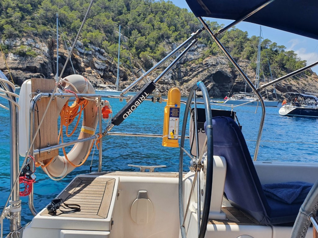 Fondeo: Dispone de un orinque preparado y un pequeño bichero que ha dejado en el pozo de ancla, al cual he añadido yo mi retenida de cadena con un tensor de goma durante le fondeo. También ha incluido 3 placas solares, dos sobre cubierta (pisables) y una grande de quita/pon en Bimini, lo que le da una autonomía casi total al barco en fondeos largos. Yo he añadido un grifo de agua salada con lo cual solvento también parte de las necesidades de agua para lavado y limpieza de vajilla.
