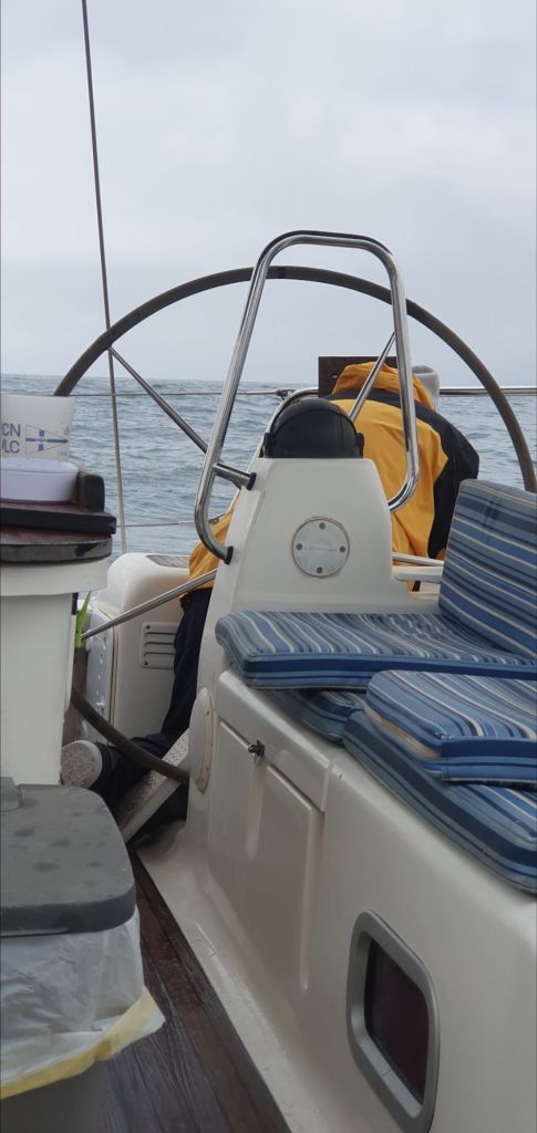 Pero el día amanece con lluvia, y muy poco viento de SE, lo cual hace que tengamos una travesía desagradable, con olas de dos metros y sin viento. Incluso uno de nosotros se ha mareado, lo que es muy extraño porque estamos todos muy acostumbrados a navegar. Otro de los cuatro que ibamos nos ha dejado, en ese caso por motivos familiares, así que seremos tres los que hagamos la regata.