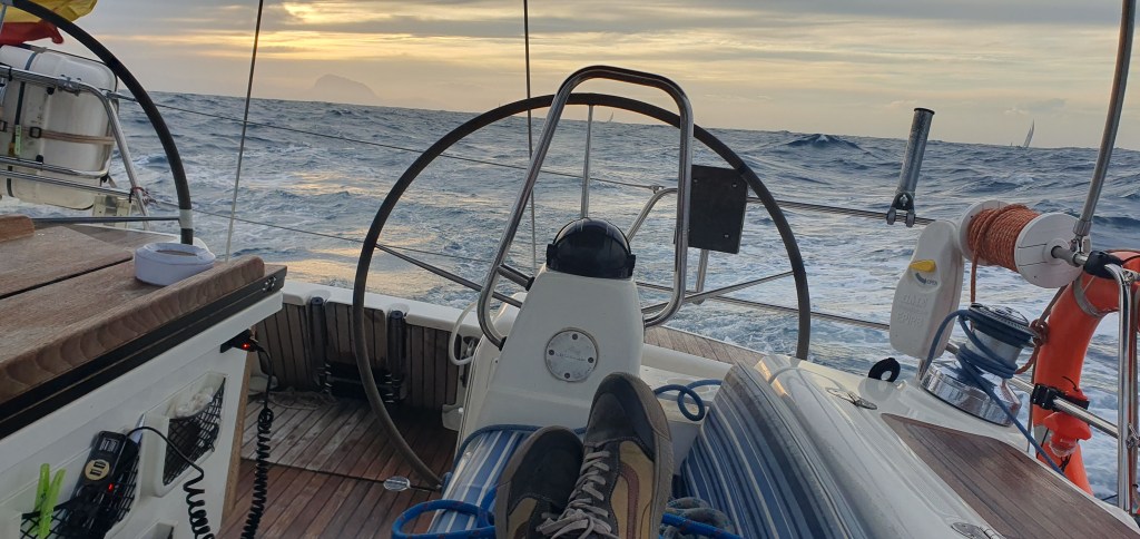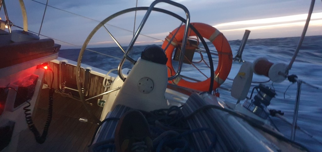 A las 8 se nos para la electrónica, perdiendo también el piloto automático, y encalla la escota de la Génova. Decimos retirarnos. El viento sigue con picos de 30+ y las olas por encima de los 3 metros. Algunos cargueros se desvían para evitar cruzarse con la regata.