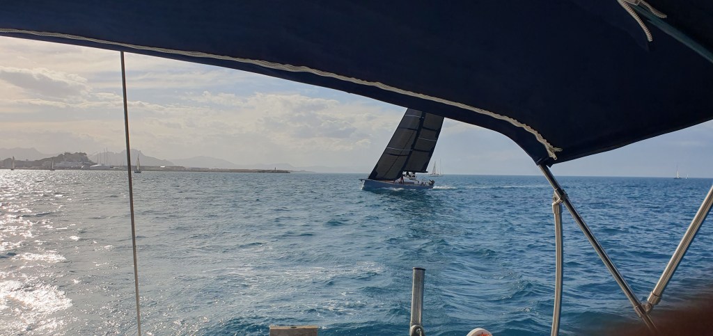 A las 7 y media ponemos un rizo en ambas velas, salta el aro salvavidas por el impacto de una ola y lo recuperamos rápidamente. Debido a ellas, los barcos orzan más de 30 grados.