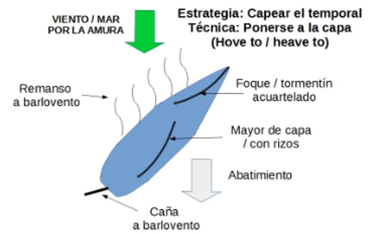 Esta maniobra, sirve también para capear un temporal, o bien para detener el barco por un rato mientras efectuamos alguna reparación, cocinamos, ponemos algún rizo en la mayor o simplemente necesitamos un momento de calma.